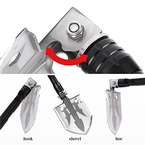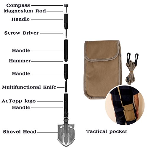 Multifunctional Design – AcTopp folding camp shovel with more than 15 functions survial tool set including Compass, Magnesium Rod, Screw Driver, Hammer, Multifunctional Knife, Shovel Head and extension handle.