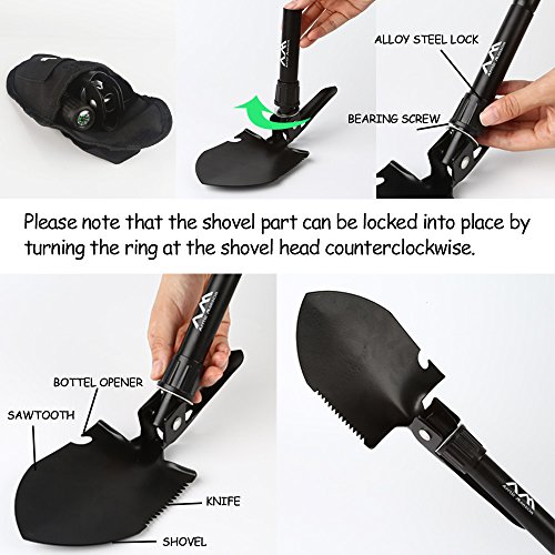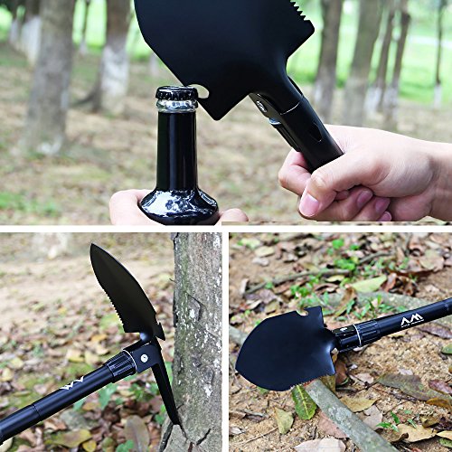 Five in One: Use it as a shovel, a pick, a saw, a compass or a bottle opener for digging, sawing, chopping, cutting, picking, prying, hammering, bottle opening, shoveling.