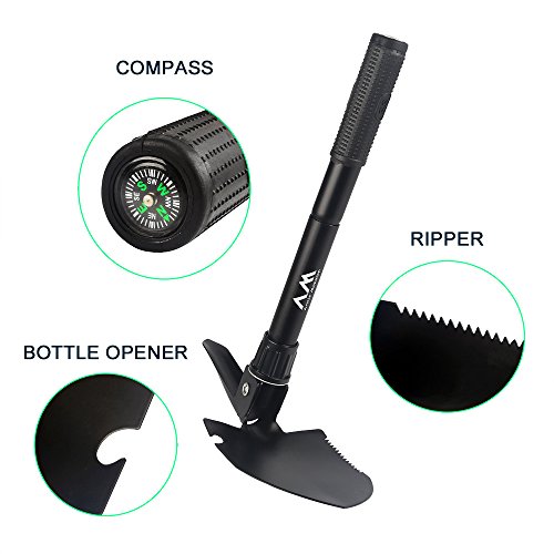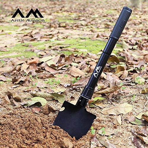 Camping Folding Shovel, Arctic Monsoon, 5 in 1 Synthetic Steel Mini Shovel with Pickax, Compass, Bottle Opener and Carry Pouch