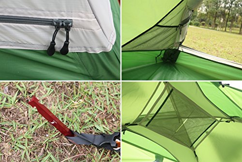 The high quality materials used make the tent fully rain proof, yet still extremely light weight. Double stitched seams are perfectly sealed for complete waterproofing. And the strong aluminum poles add plenty of stability with little weight gain. UV PROTECTION!