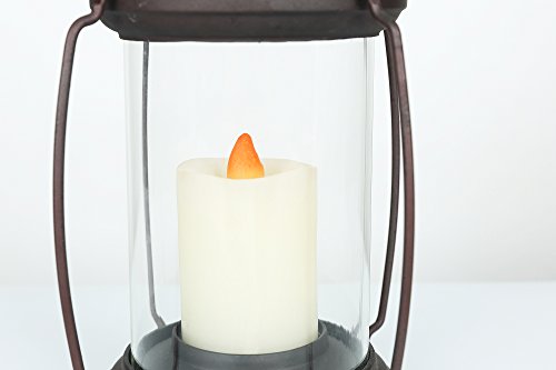 Pillar candle inside lantern contains 1 amber LED
