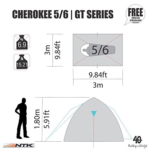 NTK Cherokee GT 5 to 6 Person 9.8 by 9.8 Foot Sport Camping Dome Tent 100% Waterproof 2500mm