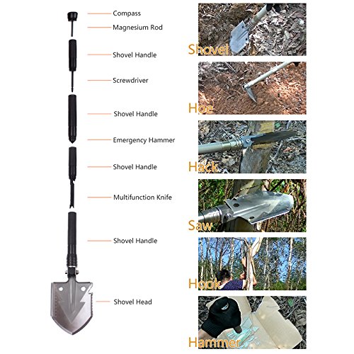 Shovel, Hoe, Awl, Hammer, Auto Emergency Escape Hammer, Saw, Knife, Cord Cutter, Bottle Opener, Fireplace-Starter Magnesium