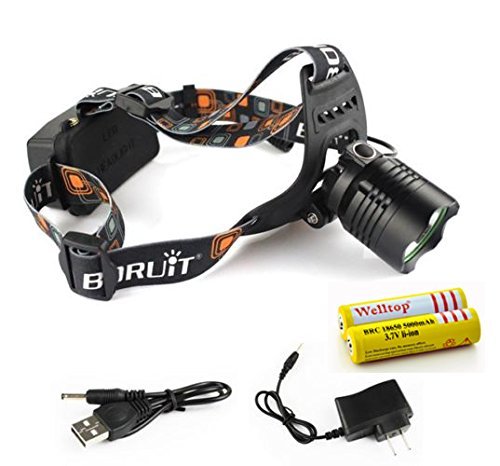 Welltop® 1200 Lumens CREE XM-L Upgraded L2 LED 5-Modes Headlamp Torch With 2Pcs 18650 5000 mah Rechargeable Battery+AC Charger+USB Cable (Black head)