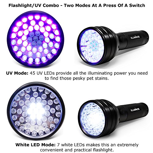 - Our UV flashlight Features 45 UV LEDs and 7 White LEDs. Easily switch backward and forward from UV and white LED mode.